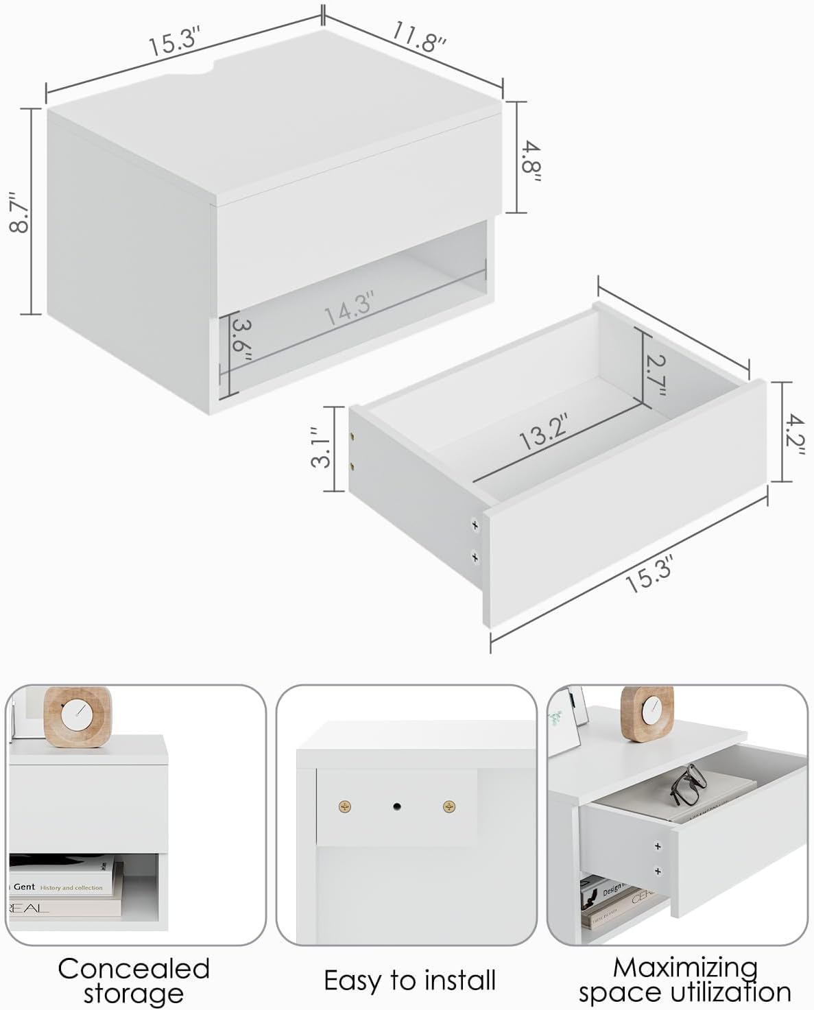 - 【Floating Bedside Table】The dreamy floating design of HEYZOEY works thanks to wall-anchored bolts provided for installation into drywall. The sturdy and solid structure supports up to 33 lbs on the tabletop and 11 lbs in the drawer. Who needs floor protector pads when your nightstand floats?