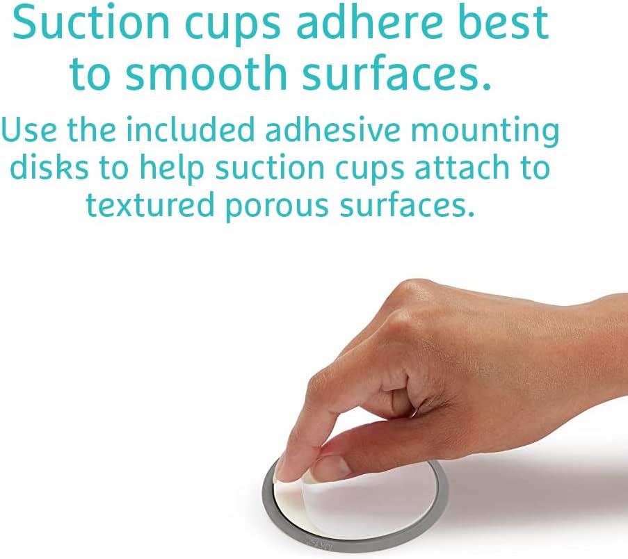 - EASY TO INSTALL: Included mounting discs help suction cups attach to textured or porous surfaces, and are easily removed for cleaning. Works best on smooth surfaces — avoid grout lines and textures